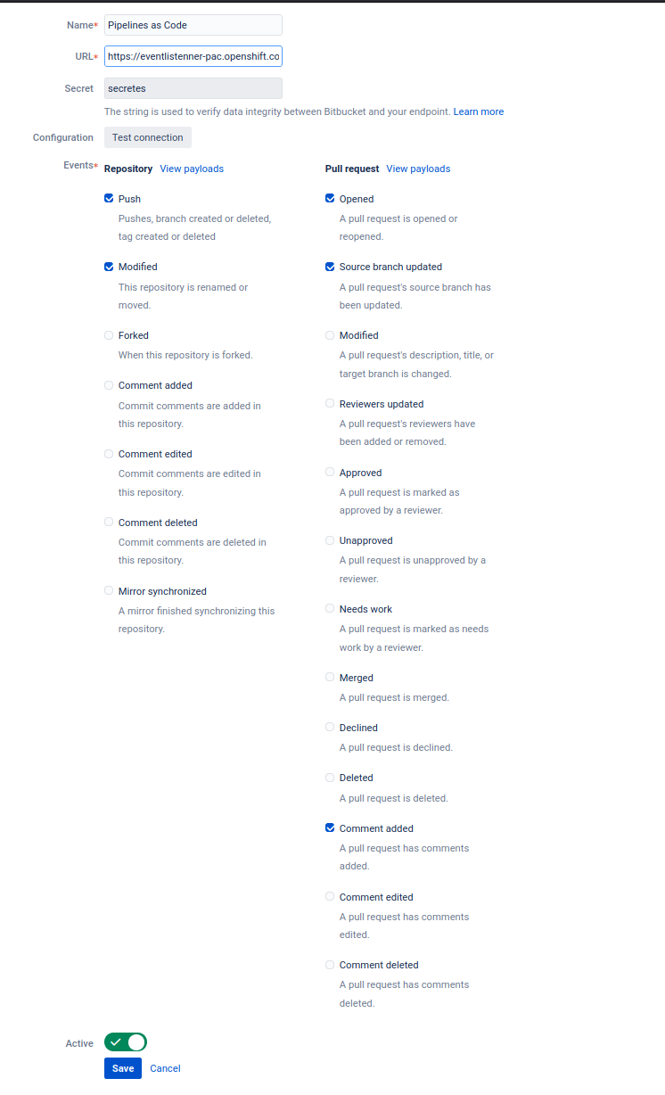 • Set the payload URL to Pipelines-as-Code public URL. On OpenShift, you can get the public URL of the Pipelines-as-Code route like this :
